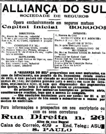 Fonte: O Estado de São Paulo (1912a, p. 8).Em março de 1913, em assembleia de acionistas, Álvaro de Menezes apresenta o relatório do ano anterior, que foi publicado como propaganda da companhia no O Estado de São Paulo; afirmando a saúde financeira da empresa, o texto detalhava a abertura de agências em várias localidades de São Paulo e outros estados como Pará, Pernambuco e Mato Grosso, além da sucursal do Rio de Janeiro. A Diretoria propunha, inclusive, a distribuição de dividendos de 10% ao ano relativos ao capital realizado (O Estado de São Paulo, 1913b, p. 8).