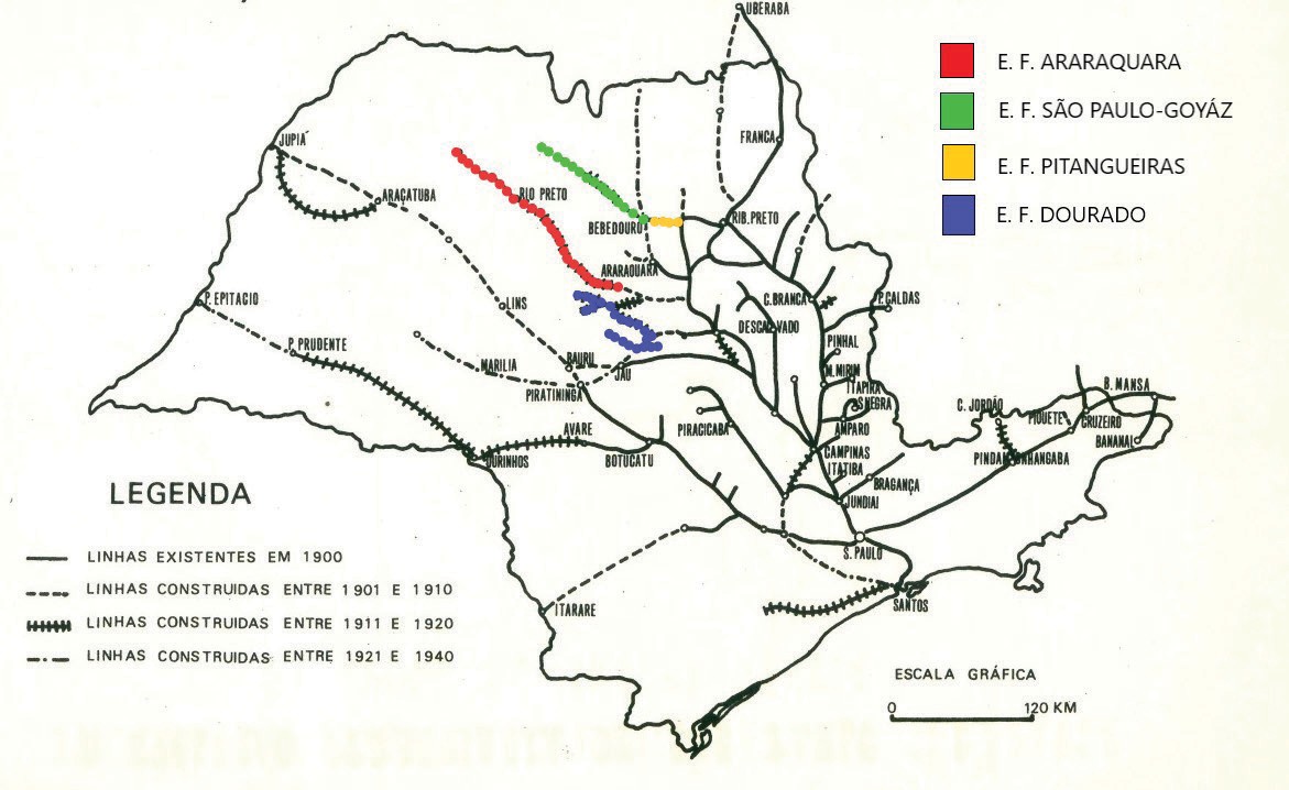 Fonte: Elaborado pelo autor a partir do mapa “A evolução ferroviária de São Paulo”, de Matos (1974, p. 132).A E.F. Pitangueiras obteve sua primeira concessão dada pela Câmara Municipal de Pitangueiras, em 1902; criada pelo engenheiro Bernardino de Queiroz Cattoni, a estrada partia da estação de Passagem, na Cia Paulista, às margens do rio Mogy no município de Sertãozinho, com destino à cidade de Pitangueiras. Mais tarde, obteve concessão para o prolongamento da linha até a povoação de Jaborandi, com percurso de 41 km (Correio Paulistano, 1913a, p. 1). O seu primeiro trecho, de 30 km, foi aberto ao tráfego em 02/12/1911 (Estrada de Ferro São Paulo-Goyaz, 1915, p. 5).