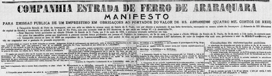As companhias ferroviárias de pequeno porte surgiram como um segmento novo no rol de títulos de empresas oferecidos aos investidores do período; mais baratos que os de suas congêneres de maior porte, que juntamente com as instituições bancárias eram os investimentos mais seguros do período (Hanley, 2001), aquelas ferrovias apresentavam condições de investimento melhores que os demais títulos oferecidos, relativos a indústrias e companhias de serviços urbanos. Em julho de 1908, pela casa bancária do conhecido corretor Leonidas Moreira, a E.F. Araraquara lança um empréstimo, em debentures, no valor de 4.000 contos de réis; o lançamento, divulgado por um manifesto publicado em diversos jornais do período, era destinado ao resgate do passivo e construção do prolongamento a São José do Rio Preto.