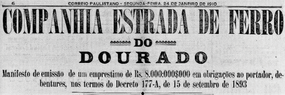 Fonte: Correio Paulistano (1908c, p. 6).Aquele contexto marca o lançamento de diversos empréstimos em debentures das companhias ferroviárias no mercado paulista; em janeiro de 1909, propaganda do corretor Leonidas Moreira destinada a quem tivesse dinheiro a empregar orientava a preferência pela compra das debêntures da E.F. Araraquara, porque pagavam bons juros. Anunciava ainda que em breve seriam negociados títulos da E.F. do Dourado (Correio Paulistano, 1909a, p. 6)[10].