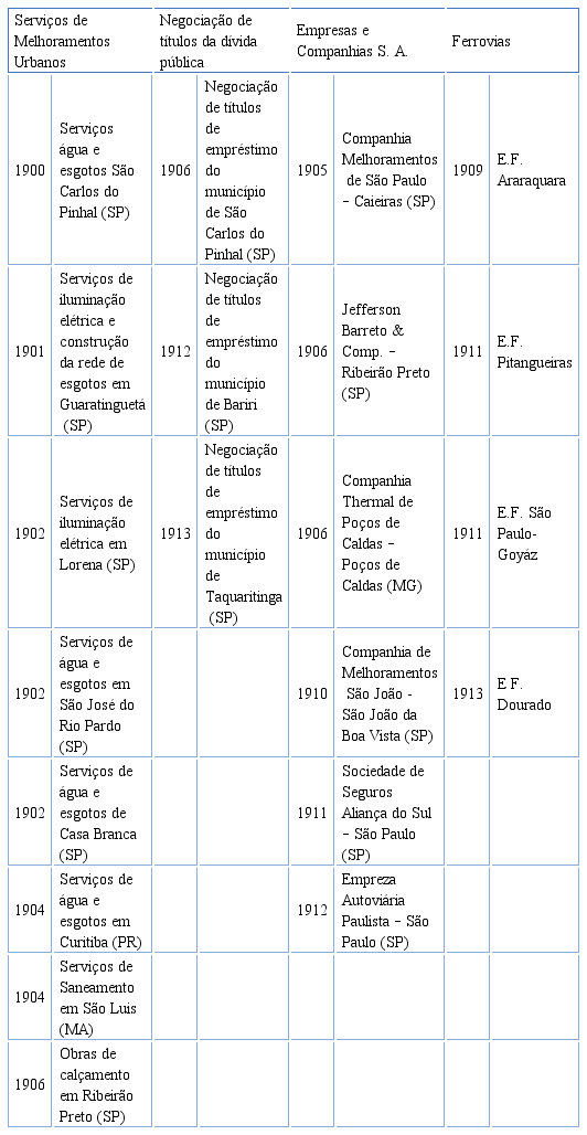 Além disso, o crescimento do mercado de capitais promoveu um boom na Bolsa de Valores paulista; o aumento do número de investidores foi acompanhado por um movimento de diversificação de oportunidades, representadas em sua maioria pelos títulos públicos, ações e debêntures de empresas (Hanley, 2001). Naquele contexto, tinham destaque as companhias ferroviárias, ao lado dos bancos, como os investimentos mais seguros e de maior retorno financeiro; no entanto, verifica-se a existência de uma diversidade de empresas, especialmente ligadas aos serviços públicos, que movimentavam o mercado do início do século.