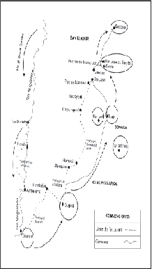 Figure 1. Spatial organization of commercial roads between Boyacá and Santander, first half of the 20th century