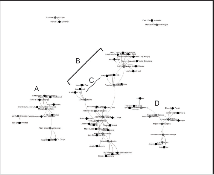 Identificación del tejido: Esta visualización es un ejemplo que representa un tejido productivo-empresarial compuesto de un conjunto de aristas y nodos, donde las aristas son las líneas que articulan los nodos. Representa trestipos de conexiones: A y D corresponden a una estructura cerradacon fuertes lazos de confianza, seguridad y sin relación con un conjunto mayor B, la cual representa un número alto de conexiones sin un tejido egocéntrico(relaciones estructuradas entorno a un foco) definida y con facilidad para hacer conexiones. Mientras que C representa el llamado “agujero estructural” (Goyal y Vega, 2007), entendido como la brecha entre dos individuos que tienen fuentes complementarias de información, poder, favores y beneficios.
