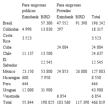 Por isso, a nova estrutura financeira internacional parecia favorável para as empresas estrangeiras. Enquanto o governo norte-americano no período do Pós-Guerra manteve seu compromisso de não assumir mais empréstimos entre governos, como era destacado nos discursos do próprio presidente Truman, eram as agências de fomento ligadas aos Estados Unidos – em tempos de Ponto IV –, que assumiriam a função decisiva nessa nova forma de financiamento à periferia. O Brasil se destacaria no volume de recursos recebidos a partir de então, tanto pelo BIRD como pelo Eximbank (Tabela 2). A priorização pelo Brasil – como pelo México – demonstra que o início do governo Vargas não era tido como um representante de posições políticas nacionalistas; pelo contrário, sustentava o país o papel de aliado fiel e de sede dos investimentos das empresas elétricas que estavam intimamente ligadas aos Estados Unidos.[38]