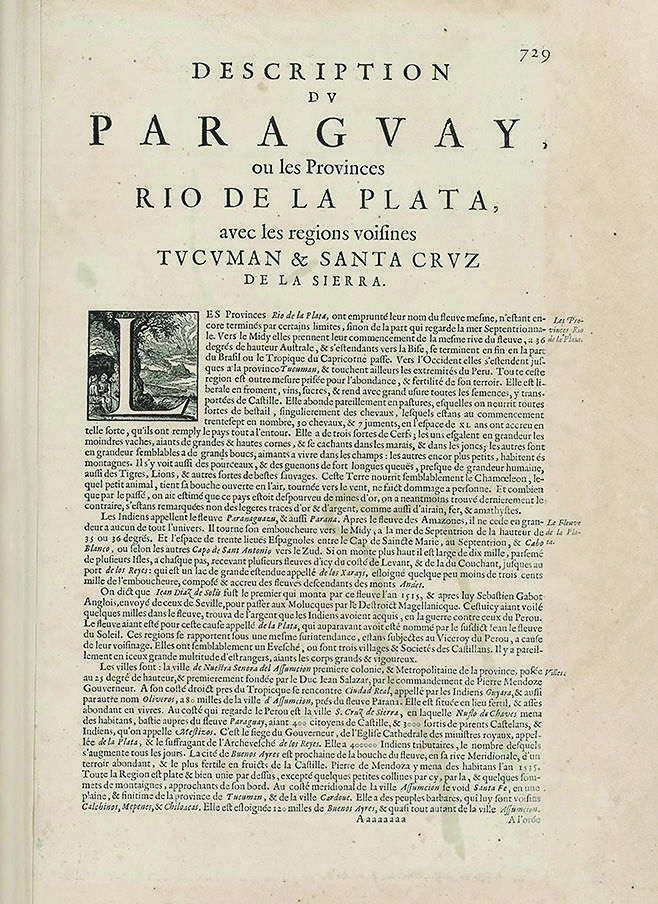 O mapa em questão aparece pela primeira vez na obra de De Laet, intitulada Nieuwe Wereldt ofte Beschrijvinghe van West-Indien, publicada em Leiden, no ano de 1625. No século XVII, o Nieuwe Wereldt ofte Beschrijvinghe [...] foi editado pelo menos quatro vezes: duas em holandês/flamengo (1625 e 1630), uma em latim (1633) e outra em francês (1640). Em todas essas edições – revisadas e ampliadas pelo próprio De Laet,– na abertura de cada livro[11], o autor inseriu um mapa correspondente à região em questão. No início do décimo segundo livro, relativo ao Río de la Plata, figura o Paraguay, ó Prov. [...].
