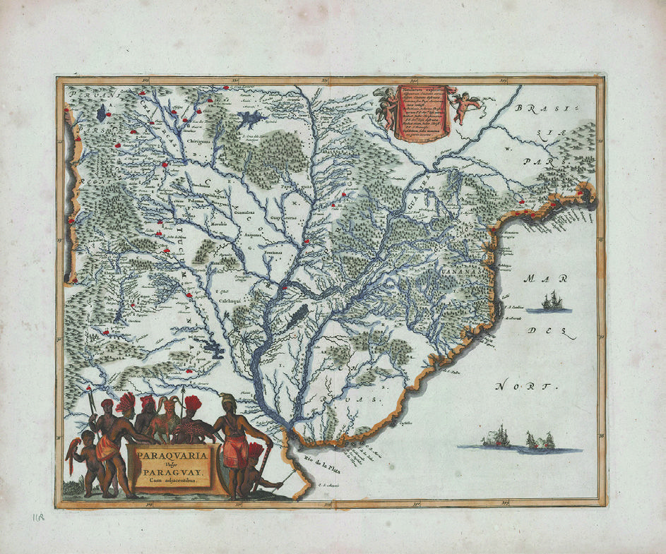 Primeiramente, por parte de ambos os lados devia haver interesses recíprocos. Aos jesuítas certamente convinha exibir, sempre que ensejasse, um refinado artefato cartográfico da “Messis paraquariensis”[23]. Para demandar recursos humanos e materiais, para obter reconhecimento e prestígio das autoridades monárquicas e eclesiásticas, para denunciar os ataques dos bandeirantes paulistas às missões jesuítico-guarani e às vilas espanholas e para os mais diversos temas relativos à vasta região, um mapa publicado por Blaeu representaria uma ferramenta de formidável impacto visual, simbólico, cognitivo e persuasivo. Em todos os sentidos, seria um artefato capaz de promover um imaginário propício à ação evangelizadora da Companhia de Jesus no Paraguai.