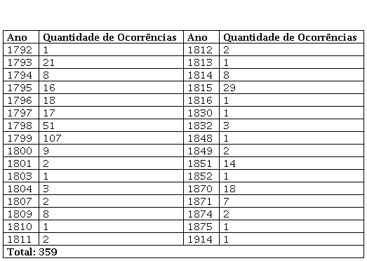 Em outras palavras, o instituto foi utilizado 359 vezes no intervalo de 122 anos, uma quantidade tão elevada de ocorrências que representaria uma média de quase três estados de sítio por ano na França. No entanto, a tabela nos mostra que em determinados anos houve maior concentração de uso do recurso do que em outros. Por exemplo, o alarmante número de 107 declarações em 1799, ano recordista em toda a história, corresponde a um momento de passagem do Diretorismo para a Era Napoleônica, corroborando o que foi dito no tópico anterior sobre seu uso massivo para repressão e centralização do poder. Essa escalada se iniciou em 1795 e totalizou 204 ocorrências até 1799[26].