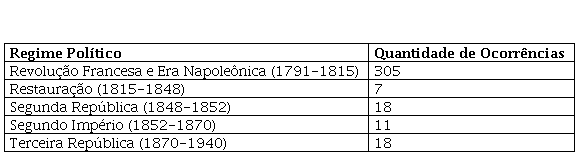 Se observarmos essas ocorrências pelo prisma dos diferentes regimes políticos na França no decorrer do referido período, teremos a seguinte composição: