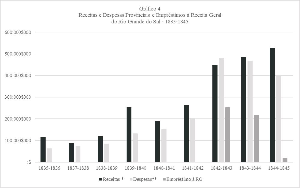 Fonte: Camargo, 1868, p. 250, 276.Considerando os dados acima, observa-se que coube às rendas gerais o suprimento da maior parte dos recursos necessários à guerra, o que em grande parte decorreu da divisão de competências estabelecida pela legislação de 1832 e 1834 e, consequentemente, da separação das tesourarias provincial e geral. Dessa forma, eram de responsabilidade do governo central os encargos com o pagamento de soldos, munício, montarias, armamentos e munições. Se, no início da década de 1830, a avultada dívida passiva e os encargos com pensões decorrentes da Guerra da Cisplatina (1825-1828) couberam exclusivamente aos cofres provinciais e foram, ao lado da nova divisão de competências tributárias, fatores que agravaram o déficit orçamentário da província, agora essas mesmas reformas desenharam as condições para que, no decorrer da Revolução Farroupilha, o ônus da guerra não recaísse sobre esse tesouro. Neste sentido, ao tornar possível a desoneração dos cofres provinciais das despesas e dívidas da guerra, essas reformas contribuíram para preparar o caminho para a pacificação e para o retorno dos antigos rebeldes ao Império.[22]