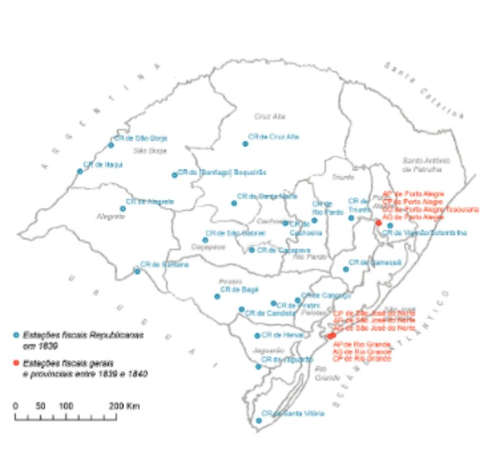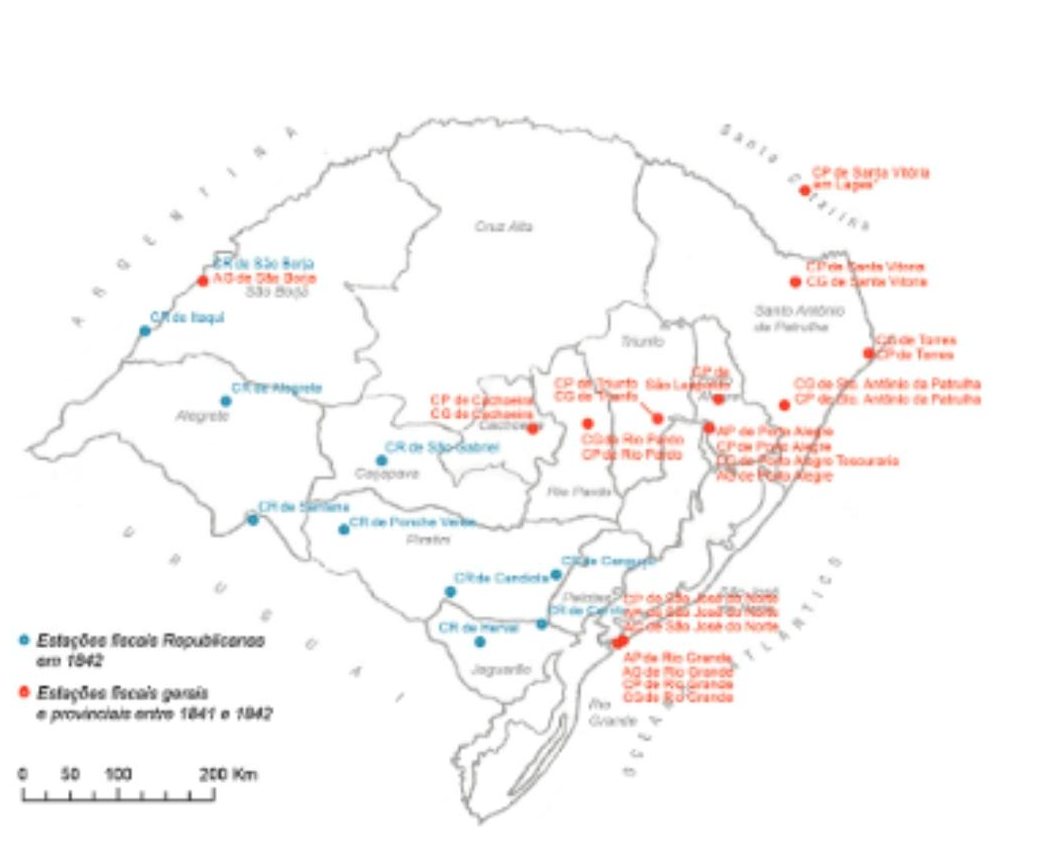 Foi somente no ano seguinte, pelo Decreto de 14 de agosto de 1838 (AHRS, CV 2846 e CV 2847, v. 5, 1981, p. 85-107), que foram criadas e regulamentadas as 23 estações fiscais do Estado Rio-Grandense, assim como estabelecido o conjunto de impostos republicanos (Miranda, 2015). No entanto, como bem salientou Flores (2002), nem todas as coletorias efetivamente entraram em funcionamento dada a dinamicidade da guerra, mas, por outro lado, é interessante observar que as localidades com estações fiscais republicanas previstas pelo decreto extrapolavam aquelas preexistentes à guerra; assim, novas localidades passaram a contar com estações fiscais num esforço para aumentar a arrecadação através de um maior controle, em especial sobre o trânsito de mercadorias.
