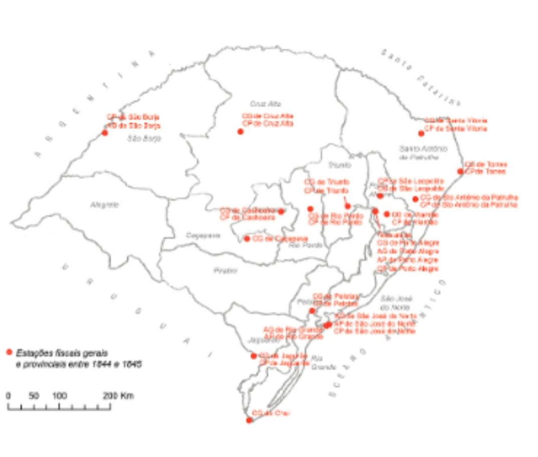 Em 1841-1842, passava-se a contar com 14 coletorias e alfândegas provinciais e 13 gerais (mapa 2), chegando, finalmente, a 17 provinciais e 19 gerais no exercício de 1844-1845, quando se aproximava o término do conflito e as forças imperiais ampliavam o território sob seu domínio (mapa 3).[20]