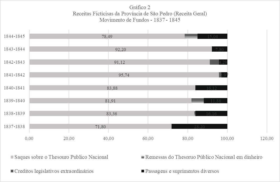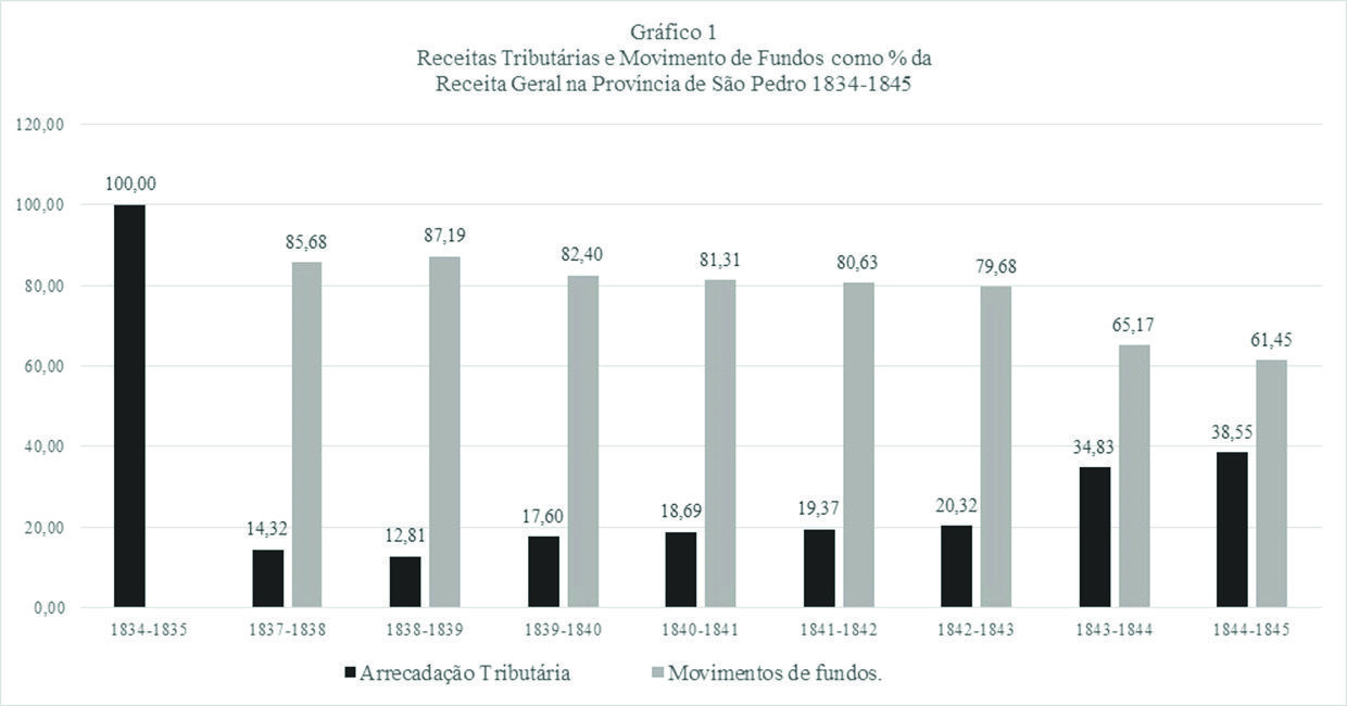 A dificuldade em retomar a organização tributária tinha reflexos diretos sobre a disponibilidade de receitas gerais. Ao longo do período da guerra, a principal fonte desses recursos estava associada aos “Movimentos de Fundos” (gráfico 1), contas que, a partir de 1837-1838, superaram em muito as receitas tributárias gerais na província.