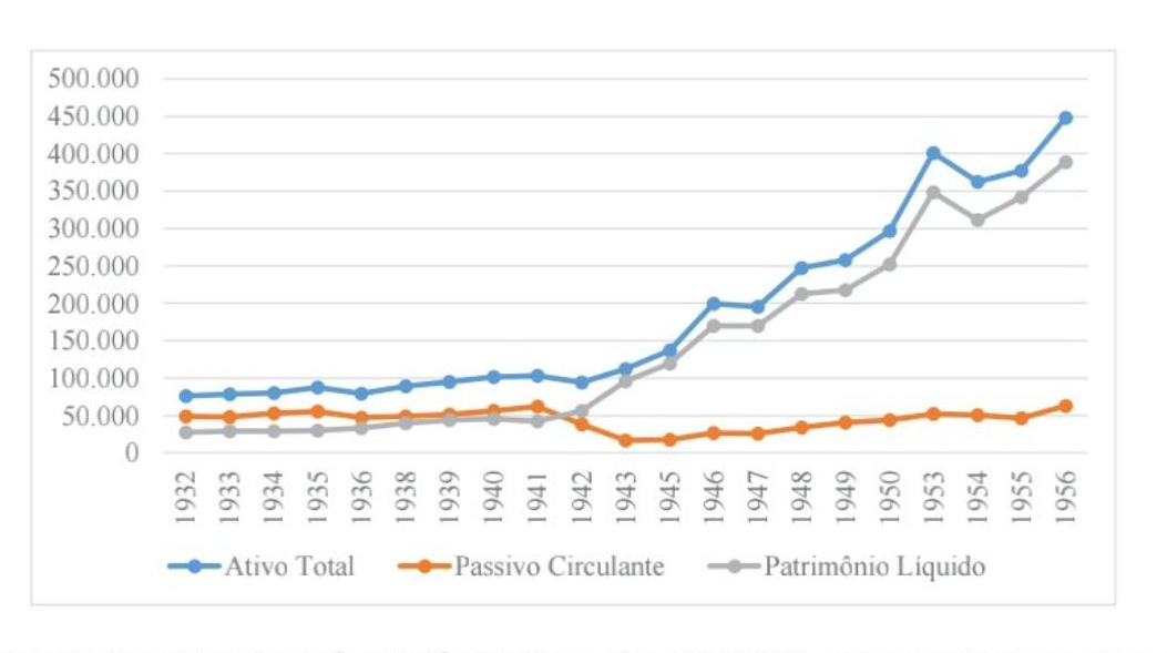 O gráfico 1 ajuda a compreender como se deu o financiamento da expansão e diversificação do Grupo Votorantim entre a década de 1930 – quando foi inaugurada a Fábrica de Cimento Santa Helena – e meados dos anos 1950 – quando se iniciou a produção na Cia. Brasileira de Alumínio. Tendo em vista que o Banco Nacional de Desenvolvimento Econômico foi criado somente em 1952 e ganharia maior relevo a partir do Plano de Metas (1956), Baer (1975, p. 90-91) aponta que grandes empresas no Brasil apoiaram-se em fontes internas – lucros retidos, por exemplo – como meio de financiamento à sua expansão dos anos 1940 até meados dos 1950.
