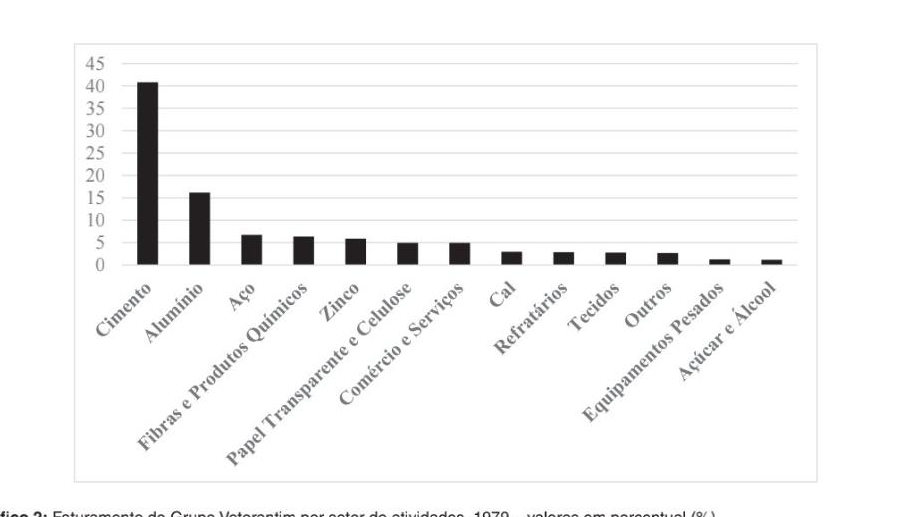 Como indica o gráfico 2, a Votorantim consolidava-se como um dos principais grupos econômicos do Brasil nos anos 1970 concentrado em seu core business: o setor de bens intermediários (cimento, alumínio, aço, fibras e produtos químicos, zinco, papel transparente e celulose) como principal gerador de receitas, que cresciam a reboque do modelo de industrialização brasileiro, e foi responsável por 81% do faturamento em 1979 (Santos, 2008, Prochnik, 1985; Pedrosa, 2015)[27]. Com uma estrutura administrativa[28] que lhe permitia atuar por todo o território nacional, o Grupo Votorantim tornou-se um importante player em diversos ramos do setor de bens intermediários: desde o princípio da década de 1960 era o maior produtor nacional de cimento; nos anos 1970, tinha a segunda colocação no setor metalúrgico e, ademais, era uma das cinco maiores empresas têxteis do Brasil (Prochnik, 1985; Caldeira, 2007)[29].
