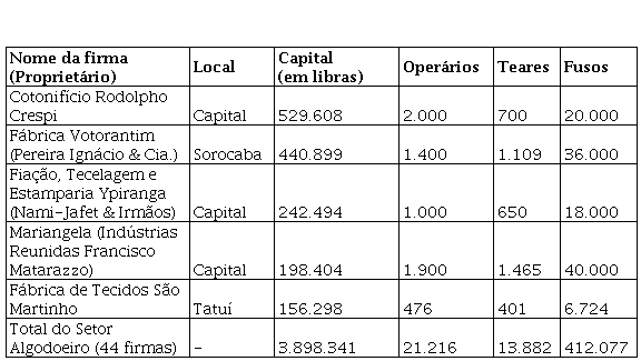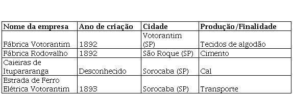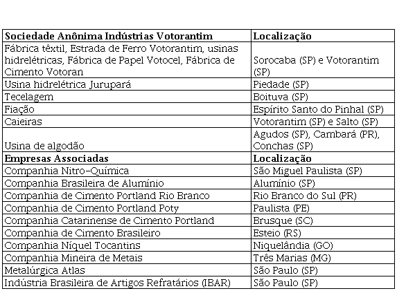 · A Fábrica Votorantim em Sorocaba-SP, que ocupava uma área de 1.070.000 m2, onde se encontravam fusos, teares, motores elétricos, turbinas e outras máquinas – na maioria importada – que se dividiam entre as seções de tecelagem, fiação, estamparia, acabamento, descaroçamento, oficinas, tinturaria, fundição e de caldeiras, além do depósito de algodão;