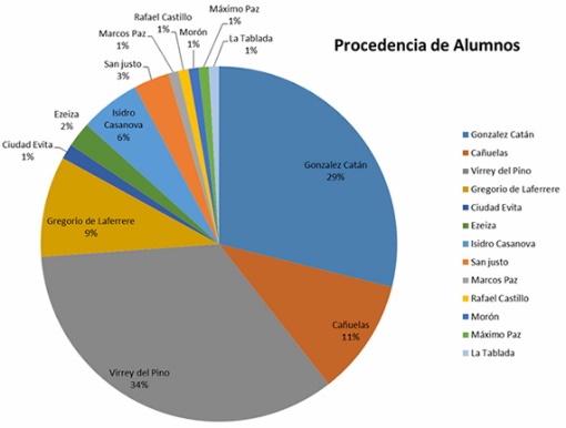 Según puede encontrarse en su página “sus más de 200 estudiantes asisten a la misma con el beneficio de una beca del 100% para completar sus estudios secundarios”. Al observar la composición de su matrícula para el año 2016 se pone de manifiesto que el 83% de sus estudiantes provienen de alguna de las localidades pertenecientes al partido. Cabe destacar en dos de las localidades del partido concentran el 63% de la matricula (Virrey del Pino 34% y González Catán 29) (gráfico 1).