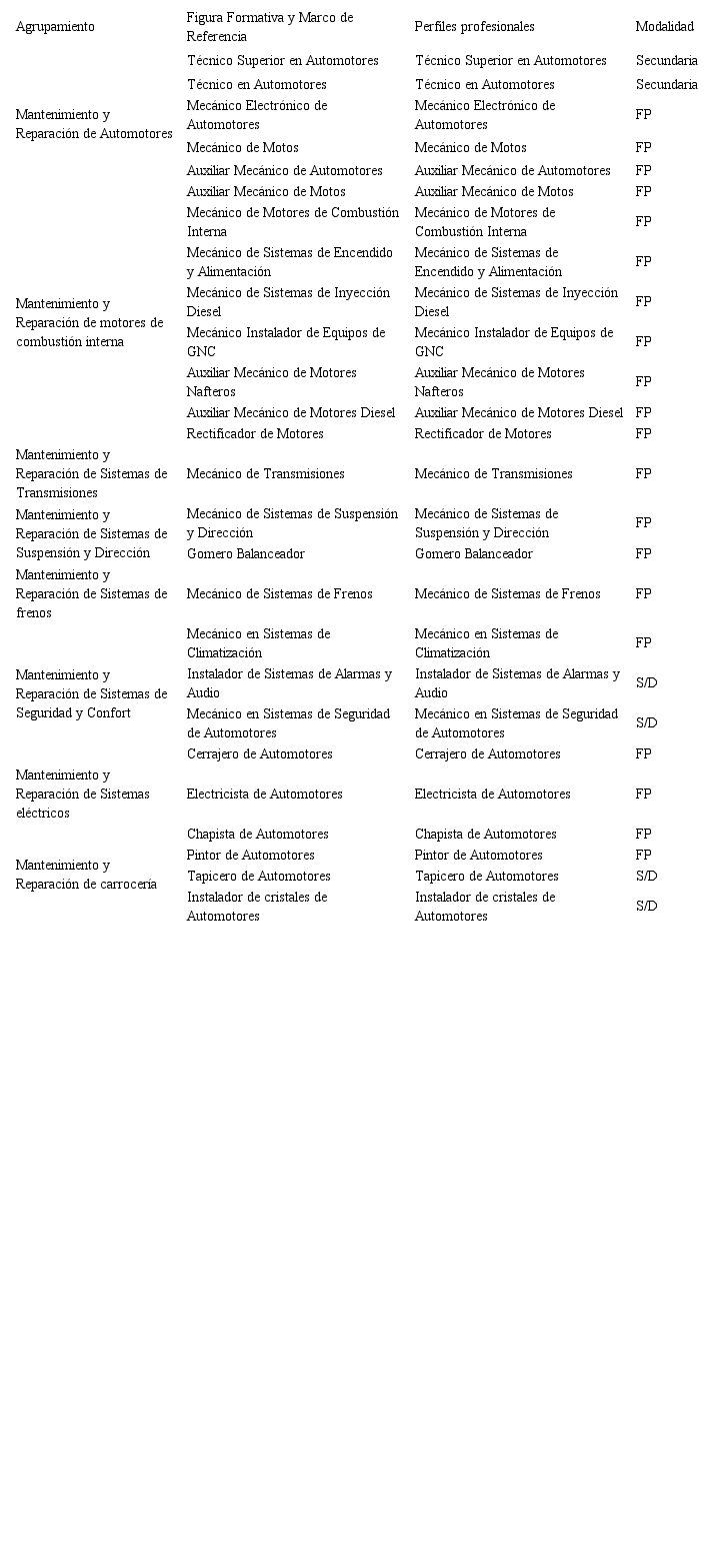 Por su parte, y con un panorama de reconfiguración de debate en torno a la necesidad de formación y sus contenidos a nivel nacional, el desenvolvimiento de las iniciativas del INET encontró para la FPA una dinámica variada. Esencialmente, la capacidad de generación de oferta y contenidos se materializo en una gran variedad de títulos y certificaciones, lo cual no obstante redundo en una menor sistematización y coordinación a nivel nacional. Centrada en la capacidad de generar cursos y contenidos, resulta pertinente resaltar que no todos los procesos formativos comprenden a una lógica de integración de los actores, debido a que muchos de ellos no cuentan con marcos de referencia ni proceso de homologación, siendo la actividad de mantenimiento y reparación quien le imprime la impronta a la formación. Con un total de 8 agrupamientos, la distribución de títulos y certificaciones encuentra en la FP el mayor número de oferta, siendo solamente en el agrupamiento Mantenimiento y Reparación de Automotores donde existen planes de estudios de Superior y Secundaria Técnica (tabla 1).