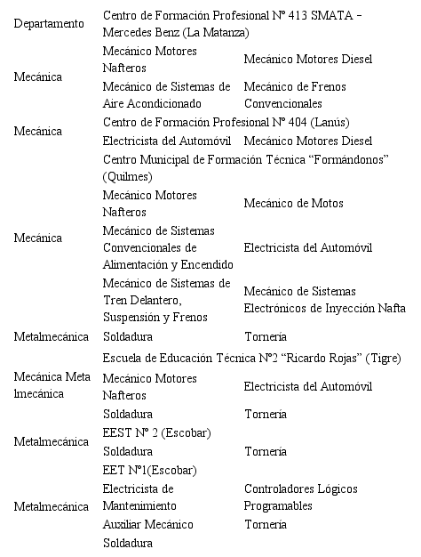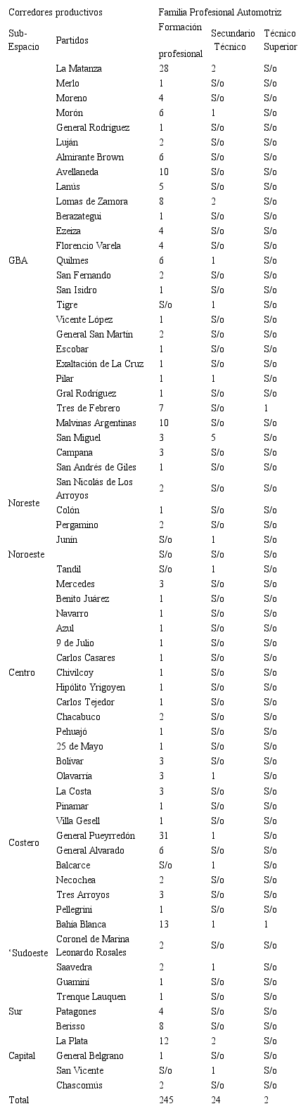 Si bien la Secundaria Técnica y el nivel Superior Técnico encuentra una oferta formativa menor que la Formación Profesional, la misma se localizan en Bahía Blanca, General Pueyrredón, La Matanza, La Plata, Lomas de Zamora, Morón, Olavarría, Quilmes, Pilar, Saavedra, San Miguel, San Vicente, Tandil y Tres de Febrero. De los 14 partidos donde se presentan instituciones formativas para estas modalidades la mayoría se encuentran en lo que se denomina Gran Buenos Aires (9 en total). La situación de la Formación Profesional muestra, no solo un predominio en la cantidad de instituciones, sino que a su vez la distribución se presenta homogénea en lo que respecta a la presencia de instituciones. Con una presencia en 66 partidos y un total de 245 instituciones (con la salvedad de Junín, San Vicente, Tandil y Tigre) la Formación Profesional se presenta en la mayoría de los casos como la única oferta existente oficial para la familia automotriz. Con una gran mayoría de partidos que presentan menos de 10 centros de formación profesional, la misma se concentra los partidos de Gral. Pueyrredón (31), La Matanza (28) Berisso (13), La Plata (12), Avellaneda (10) y Malvinas Argentinas (10) (tabla 2).