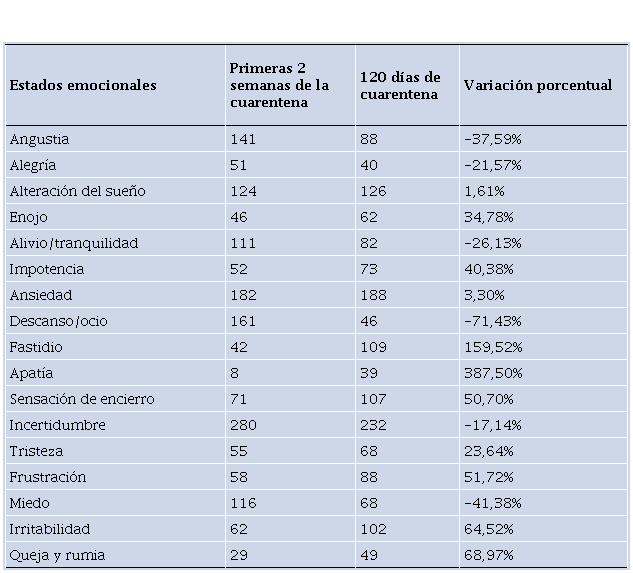 A los 120 días, los estados emocionales prevalentes fueron: incertidumbre 47%, ansiedad 38,1%, alteración del sueño 25.7%, fastidio 22.2% y sensación de encierro 21.8%. Puntualmente el miedo se hizo presente a los 15 días en un 23.6%, pero disminuyó en la segunda etapa a un 13.8%.