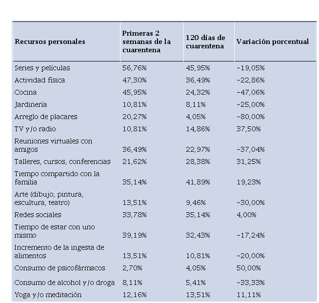 En cuanto a los recursos personales las series y películas han sido las más elegidas, provocando seguramente un cambio de horarios afectando así el sueño (la alteración del sueño se mantuvo estable en ambos momentos); por otro lado es notable como la actividad física aparece entre las primeras elecciones en las dos etapas, siendo este un recurso sumamente saludable y útil en esta crisis, a efectos de fortalecer el sistema inmunitario, la cual sería importante promover a modo de prevención primaria y secundaria.