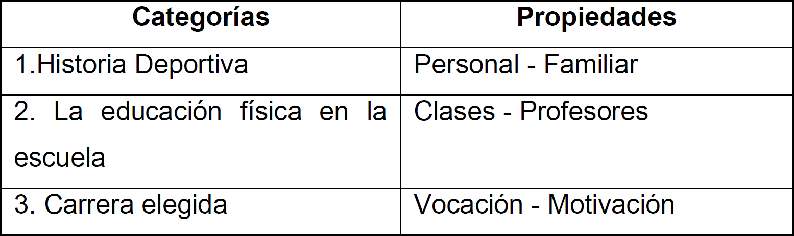 La información obtenida a través de las entrevistas se procesó mediante el método comparativo constante que permitió construir un sistema de categorías de análisis (Strauss y Corbin, 2002) del cual emergieron el tránsito por la historia deportiva, las vivencias relacionadas a la educación física escolar y las percepciones sobre la carrera elegida. Mediante dicho tratamiento de los discursos fue posible la elaboración de una teoría fundamentada (Glasser y Strauss, 1967) a partir de los relatos de los entrevistados que funcionaron como referencias empíricas del conocimiento producido.