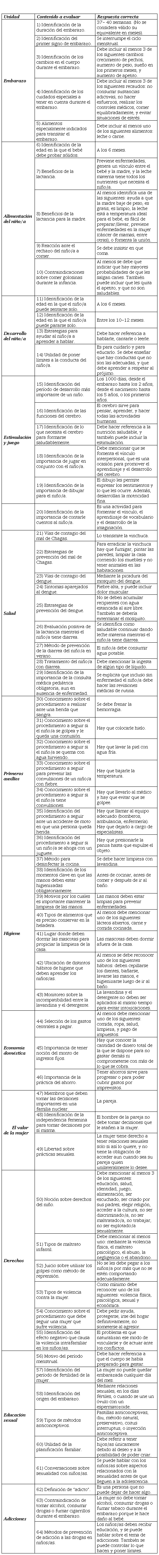 Además, es conveniente que el cuestionario sea más breve y aborde la unidad temática enseñada en el corriente mes. Esto implicaría menor tiempo de administración, así como también sería esperable que las madres sepan responder mejor por disminuir el lapso entre que se enseñó el contenido en el taller y que se evaluaron los contenidos. Asimismo, como las mujeres pueden incorporarse en cualquier momento del año, es lógico que las recién ingresadas tengan más errores en los temas abordados previo a su llegada. Podría pensarse que metodológicamente sería una ventaja mantener todos los ítems a fines de comparar los conocimientos de las participantes recientes y las que están hace más tiempo, bajo el supuesto de que estas últimas deberían rendir mejor. No obstante, este ejercicio puede realizarse con un grupo control, tal como fue hecho en el relevamiento 2015-2016.