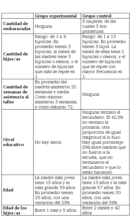 Uno de los problemas que se identificó fue el proceso de selección de las participantes del grupo control cuyo promedio de edad era mayor al del grupo experimental, y por ende se puede inferir una diferente experiencia en el maternaje. Es decir, podría inferirse que en este caso la disparidad de edades podría haber beneficiado al grupo control porque eran mayores y por ende más experimentadas. Igualmente, del análisis se desprende que las madres participantes aprobaron, en promedio, una mayor proporción de las dimensiones evaluadas que el grupo que no participaron del taller; las primeras (67%) superan a las segundas (59%) en 8 p.p. y dicha diferencia es estadísticamente significativa.