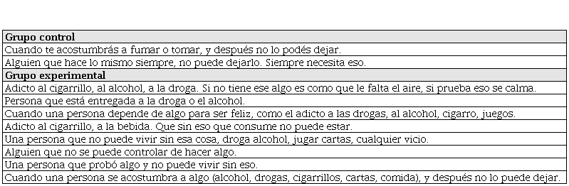 También al considerar la pregunta 62, sobre la definición de “adicto”, cuya respuesta es “Persona que no puede dejar de hacer algo” (sic). En este caso, es inexacta la definición, ya que no establece el aspecto nocivo de la adicción para el sujeto.