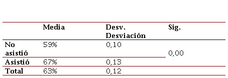 Ya hechas todas las observaciones sobre el proceso de codificación que se llevó adelante, seguidamente se presentan los resultados estadísticos de la evaluación. En la Figura 5 se observa que el grupo experimental respondió mejor que el de control, ya que lo supera por 8 p.p. y esta diferencia es estadísticamente significativa (p-valor = 0,00).