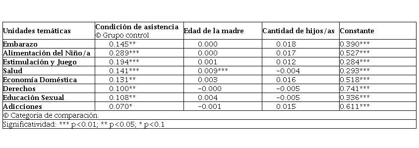 Además, dado que hay disparidades en las muestras en factores sociodemográficos relevantes, es conveniente recurrir a un análisis de regresión para evaluar el rendimiento en el cuestionario manteniendo controladas las variables que pueden estar incidiendo en el resultado, que son la condición de participación en el taller, la edad de la madre y la cantidad de hijos/as. Es decir, mediante un modelo de regresión lineal se puede establecer la correlación entre las variables de resultados y la implementación del programa, controlando por el factor de edad de la madre y el de cantidad de hijos/as. Se busca evaluar si estos dos tienen peso explicativo en el porcentaje de respuestas correctas, independientemente del efecto que pueda tener en ello participar en el programa. Entonces, para cada una de las 12 dimensiones evaluadas, se estimó el siguiente modelo: