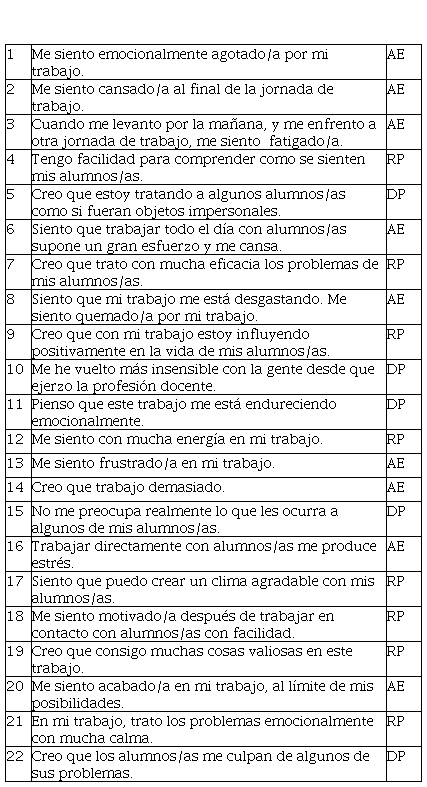 El instrumento Maslach Burnout Inventory (MBI) en su versión española, destinado a evaluar y cuantificar la prevalencia de síndrome de burnout en los docentes, consta de 22 ítems en forma de afirmaciones, que evalúan las tres dimensiones del síndrome: agotamiento emocional (AE), despersonalización (DP), y realización personal (RP). Los ítems que incluye el inventario MBI, se recogen en el cuadro 2. Los sujetos valoran cada ítem del cuestionario con una escala tipo Likert, a través de la cual indican con qué frecuencia han experimentado la situación descrita en el ítem a lo largo del último año, y se procede a sumar las puntuaciones dadas para cada dimensión. Esta escala de frecuencia tiene 7 grados, que va de 0 (nunca) a 6 (todos los días). El instrumento goza de una excelente consistencia interna y fiabilidad, medida a través del α de Cronbach, con α de 0.9 en la dimensión Agotamiento Emocional, un α de 0.79 para Despersonalización, y α de 0.71 para Realización Personal en el trabajo, según el manual de Seisdedos (1997). El cálculo de las puntuaciones obtenidas en cada dimensión se realiza sumando los valores asignados por los encuestados en los ítems que engloba la dimensión en cuestión.