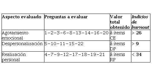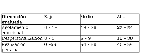 Las puntuaciones de cada dimensión deben mantenerse separadas, y no deben ser sumadas en una puntuación única, debiéndose valorar cada dimensión a tenor de los criterios de punto de corte de Maslach y Jackson (1986). Posteriormente, se evalúa para cada sujeto de la muestra la prevalencia del síndrome de burnout, teniendo en cuenta que cuanto más elevada sean las puntuaciones de las dimensiones de AE y DP, y más baja puntuación en la dimensión RP, mayor es el nivel de burnout. De la misma forma, burnout bajo se caracteriza por niveles bajos de AE y DP, y elevados de RP. A su vez, niveles medios de burnout se encontrarían en el resto de las posibilidades.