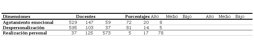 En la dimensión agotamiento emocional, los resultados arrojaron que un 72% de docentes presenta un alto grado de agotamiento emocional, la prevalencia en grado medio asciende al 20%, siendo sólo un 8% los docentes que presentaron un nivel bajo en la dimensión en cuestión. Los docentes destacaron: una elevada carga laboral, excesiva dedicación, excesivas exigencias docentes e investigativas, frustración, cansancio crónico, desgaste laboral, y elevado estrés derivado de la atención al alumnado. Respecto a la dimensión despersonalización, se obtuvo un 81% en grado alto, un 14% en grado medio, y un 5% en grado bajo. Esta dimensión se caracteriza por el cinismo, desinterés, pesimismo, negatividad, insensibilidad e indiferencia, desarrollando actitudes distantes hacia el alumnado. En la dimensión realización personal, el docente evalúa sus sentimientos y emociones en cuanto a: compresión, altruismo, motivación, enérgico, generador de buen ambiente en el aula, eficacia en la atención del alumnado, estima hacia su trabajo, y calma emocional en la resolución de problemas del entorno laboral. Los resultados obtenidos arrojan un 5% de prevalencia en grado alto, un 17% en grado medio, y un 78% en grado bajo, lo cual significa que sólo el 5% de la muestra estudiada se siente realizado profesionalmente en términos de logros, motivación, y productividad laboral. En la tabla 3 se recogen los resultados obtenidos respecto a cada dimensión del síndrome de burnout.