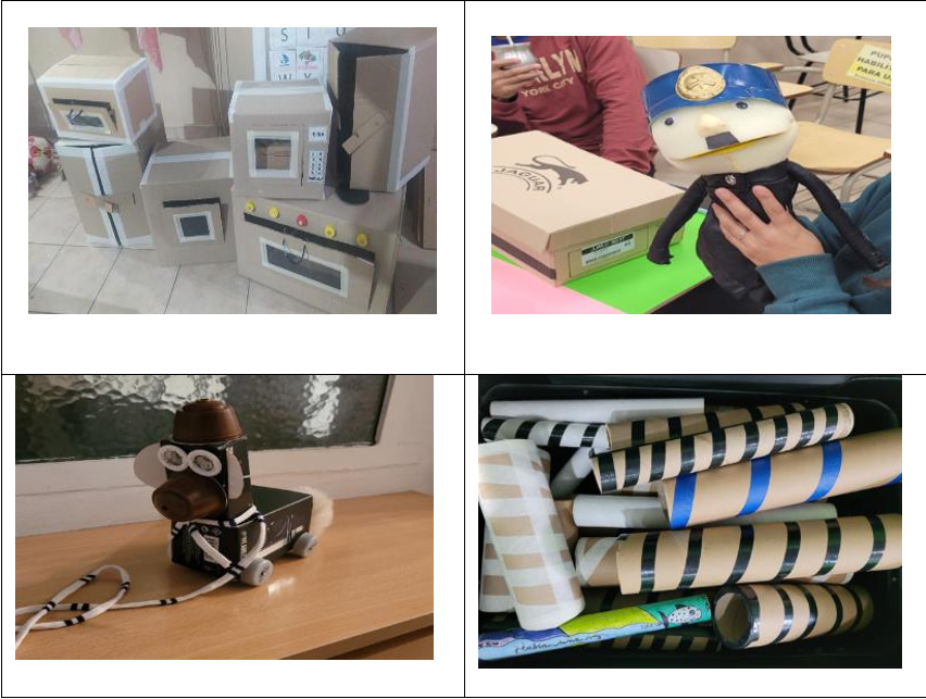 - Reconocemos que esas creaciones, realizadas con materias primas (como cartón, telas, botellas de plástico, tubos, papel higiénico, diarios, arena) recién en la experiencia lúdica devendría como juguete, a partir de las acciones y transformaciones de las/os niños junto a sus referentes.