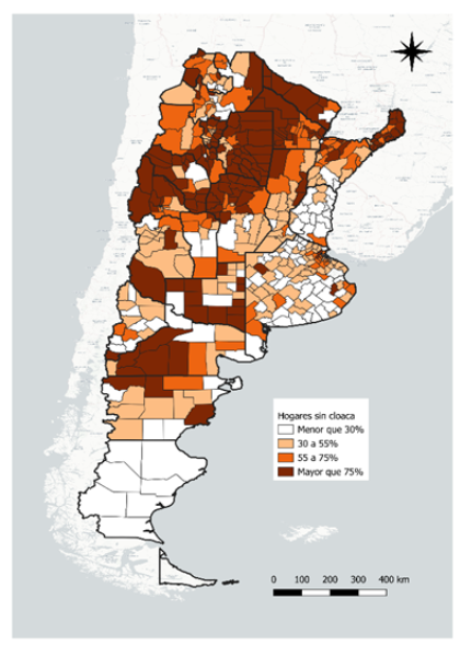 Finalmente, la Figura 9 destaca que más los departamentos con mayor carencia (más del 75%) están concentradas en el norte del país, abarcando provincias como Chaco, Formosa, y sectores del noroeste argentino (Salta, Jujuy, Santiago del Estero). Este déficit crítico en infraestructura de saneamiento subraya la alta vulnerabilidad sanitaria de estas regiones y su asociación con mayores riesgos de enfermedades relacionadas con la falta de acceso a sistemas cloacales adecuados. Los departamentos con niveles intermedios de carencia (55%-75%, marrón medio) se distribuyen en zonas del centro y el litoral, como algunas partes de Entre Ríos, Córdoba, y Corrientes, reflejando una cobertura insuficiente de sistemas cloacales en áreas periurbanas y rurales.