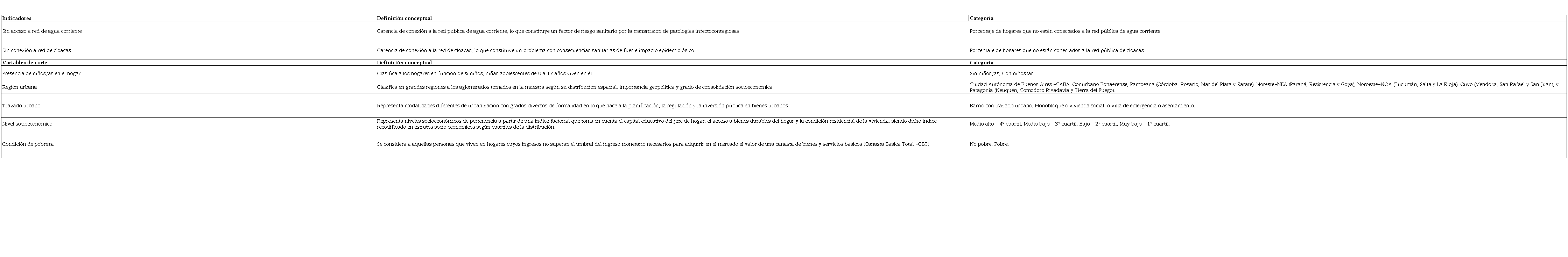 Con respecto a las mediciones de la EDSA, se analizan dos variables disponibles vinculadas al acceso al agua y saneamiento en Argentina y cinco variables de corte. A continuación, se presentan las definiciones de las mismas.