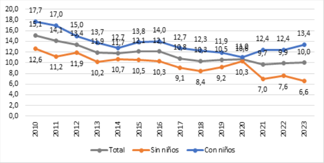 Cuando se considera la presencia de niños/as en el hogar, las diferencias son notorias (Figura 1). Los hogares sin niños/as muestran una reducción más consistente y pronunciada que sus pares con niños: del 12,6% en 2010 al 6,6% en 2023. Por otro lado, los hogares con niños/as enfrentaron una disminución menos constante y aún presentan mayores porcentajes de déficit. En 2010, el 17,7% de estos hogares carecía de conexión, y aunque en 2023 esta cifra descendió al 13,4%, la merma fue de 4,3 puntos porcentuales frente a 6 puntos en los hogares sin niños/as. Es importante señalar que, a partir de 2020, se observa una leve tendencia al alza en este grupo, alcanzando en 2023 valores similares a los de 2016, lo que sugiere un estancamiento o incluso un retroceso en la mejora de acceso para esta población específica.