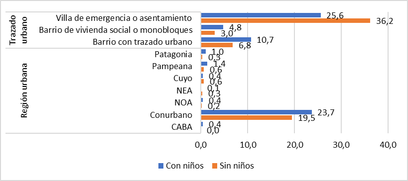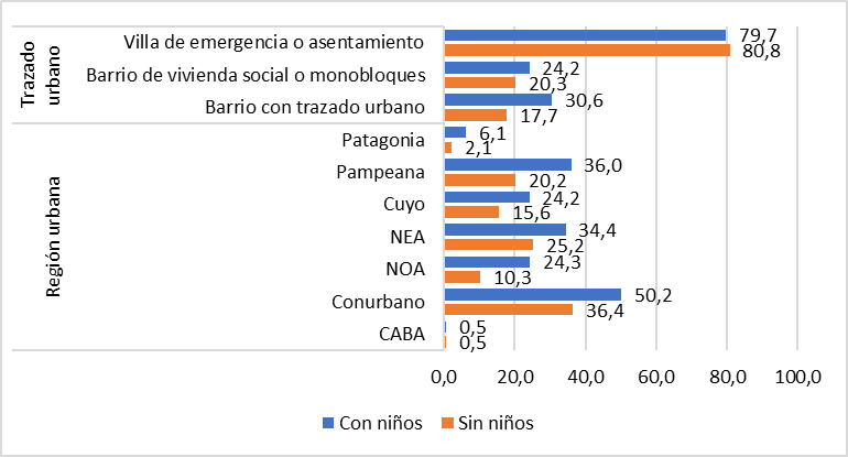 Con respecto al trazado urbano, se observa que apenas el 10,7% de los hogares con niños/as que viven en barrios con trazado urbano carecen de conexión a la red de agua corriente. Mientras que los hogares que se localizan en villas de emergencia y asentamientos registran mayores niveles de déficit, afectando más negativamente a los hogares sin niños/as. La elevada tasa de hogares que no tienen conexión a red de agua corriente en estos asentamientos se debe a su crecimiento informal y rápido, lo que dificulta la planificación y provisión de servicios esenciales[4].