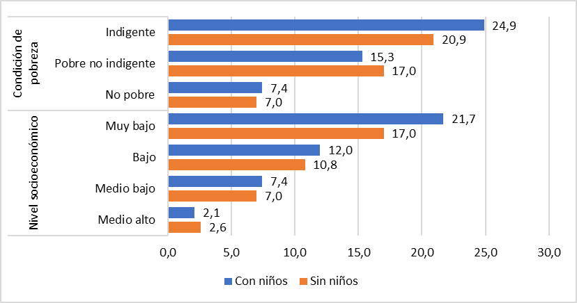 Los hogares que pertenecen al nivel socioeconómico alto tienen las menores tasas de desconexión cloacal, con un 7,4 % para hogares con niños/as y un 5,8 % para hogares sin niños/as (Figura 6).