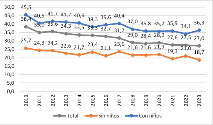A nivel general, el porcentaje de hogares sin acceso a la red cloacal disminuyó del 38,4% en 2010 al 27,0% en 2023 (Figura 4). Esta caída de más de 11 puntos porcentuales refleja avances en la expansión de infraestructura sanitaria durante el período, aunque el ritmo de reducción ha sido más lento en los últimos años, especialmente a partir de 2019, donde la mejora se estabiliza alrededor de 0,5 puntos porcentuales interanuales. Los hogares con niños/as enfrentan una mayor y más persistente falta de acceso a la red cloacal a lo largo del período. En 2010, el 45,5% de estos hogares no tenía acceso a la red cloacal, cifra que disminuyó al 36,3% en 2023. Aunque se trata de una mejora de casi 10 puntos porcentuales, este grupo presenta tasas significativamente más altas que los hogares sin niños/as durante todo el período.