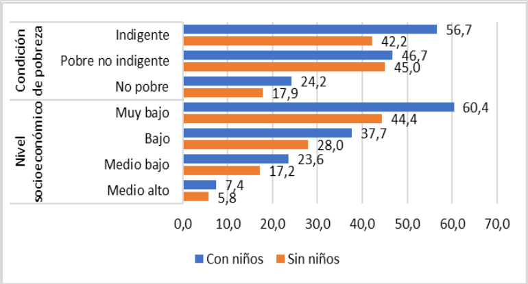 La desconexión aumenta progresivamente con la vulnerabilidad socioeconómica, ya que en los hogares del estrato muy bajo la desconexión alcanza un 60,4 % en hogares con niños, el nivel más alto después de villas y asentamientos, lo que refleja una profunda desigualdad en el acceso a infraestructura básica.