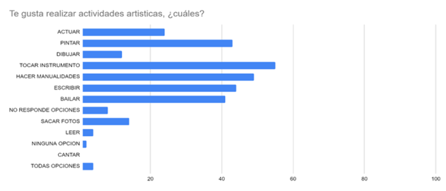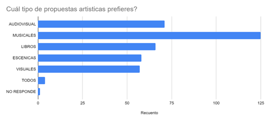 Ahora bien, en cuanto a los espacios que prefieren a la hora de realizar este tipo de actividades detectamos que, en líneas generales, se vinculan con sus propios intereses, la gratuidad y lo estacional ―frío, espacios cerrados; cálido, espacios al aire libre―; aunque se detecta una notoria mención por la búsqueda y selección de espacios al aire libre. Con relación a los espacios vinculados a lo cultural, se percibe cierta tendencia a decidirse por lugares que les permitan articular una multiplicidad de ofertas artísticas escogiendo, en primer lugar, propuestas que devienen de las artes musicales (125 encuestados), luego las artes audiovisuales (71 encuestados), seguidas por la literatura, las artes escénicas y, por último, las artes visuales (52 encuestados)[7]. Nuevamente, podemos reagrupar a este conjunto de público en: un segmento que se corresponde por la elección de actividades que se vinculan con lo artístico en relación a las artes visuales ―tipología de museo en que se realizó el estudio― cercano a la idea de visitante cautivo/regular en referencia a la categoría de espectador[8]; y un segmento mayor que disfruta de actividades vinculadas a lo cultural y las artes desde una lectura más amplia, lo que implica elecciones de ofertas más diversas de aprendizaje e ocio.