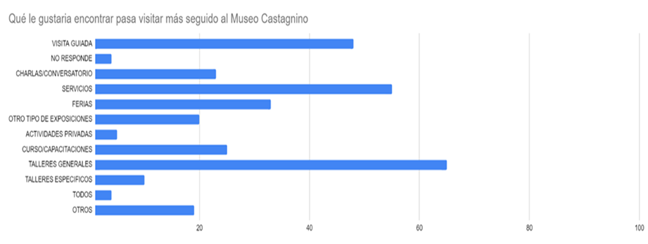 En lo que refiere a la segunda agrupación, sobre laspercepciones del Museo Castagnino y lo artístico, detectamos que este segmento de público reconoce que esta sede museal fue modificando su perfil en los últimos años, esto se manifiesta en expresiones que recuperan el encuentro con propuestas inesperadas, artistas o lenguajes/materialidades visuales distintas o desconocidas. Sin embargo, mencionan que consideran necesario lograr aún un mayor diálogo con otras disciplinas artísticas ―en línea con lo referenciado en el párrafo anterior― como, por ejemplo, un mayor número de ofertas de artes musicales y/o escénicas; narrativas expositivas que respondan al presente y/o al contexto actual; y otro tipo de actividades. Sobre este último punto podemos referenciar iniciativas vinculadas a talleres generales (65 encuestados); servicios como cafetería (55 encuestados); visitas guiadas por las exposiciones (48 encuestados); ferias (33 encuestados); charla y conversatorios de problemáticas generales (23 encuestados); cursos y capacitaciones (25 encuestados); etcétera. Además, expresaron que estas actividades podrían realizarse en otros espacios, indicando la posibilidad de incorporar más propuestas en el salón principal, la explanada de ingreso y/o el parque circundante. No obstante, plantearon que las veces que han asistido, por ejemplo, a alguna estrategia periférica en la explanada consideran que la sede museal queda en un segundo plano. Todo ello, demarcar que este segmento de público percibe un aggiornamiento del museo rosarino vinculado sobre todo a lo artístico, pero que persiste una falta de ofertas más amplia con respecto de otras artes, de conexión entre espacios y actividades, además de cierta marginalidad de aquello que no se correspondan con lo expositivo, entre otras posibilidades.