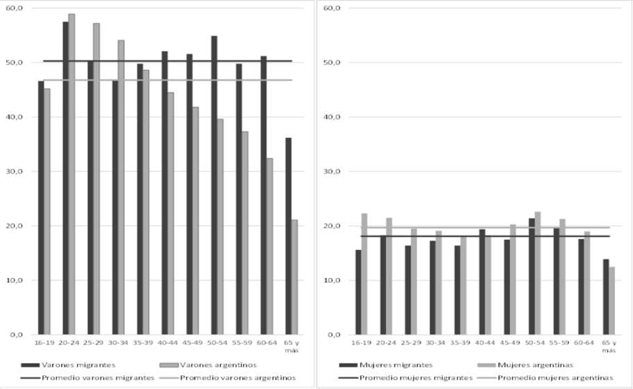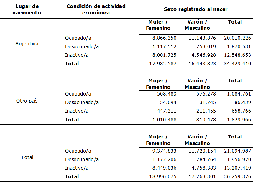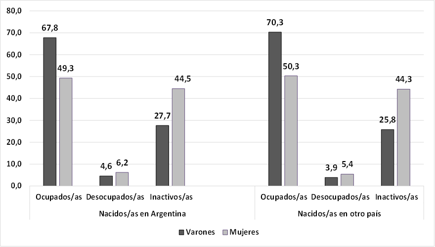 Si se consideran las cifras absolutas (Tabla A del Anexo) se halla que, del total de personas de 14 años o más, 21,1 millones se encuentran ocupadas, siendo la amplia mayoría (95%) de nacionalidad argentina. Dentro de ese conjunto, los varones predominan entre quienes declaran estar ocupados. Más específicamente, representan el 56% entre los nativos, y el 53% entre los migrantes. Por su parte, se contabilizan 2 millones de personas desocupadas y 13,2 millones inactivas. En estos dos últimos grupos -desocupación e inactividad- las mujeres tienen una participación significativamente mayor, superando el 60% tanto en la población migrante como en la nativa.