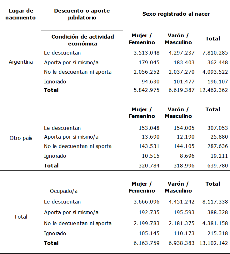 Para este artículo se trabajó con la población nacida fuera de Argentina (variable P13 “Lugar de nacimiento”) que reside habitualmente en dicho país. Asimismo, definimos como asalariados/as a quienes se ubican en las categorías ocupacionales empleada(o) u obrera(o), servicio doméstico o trabajador(a) familiar de la variable P30 “Ese trabajo ¿lo hace como…”. Nos aproximamos a la condición de formalidad/informalidad en el trabajo a partir de la variable “Descuento o aporte jubilatorio”, asumiendo que se encuentran laboralmente formalizadas aquellas personas que realizan aportes o a quienes se les descuentan. En el apartado de antecedentes abundaremos en la conceptualización de dicha noción.