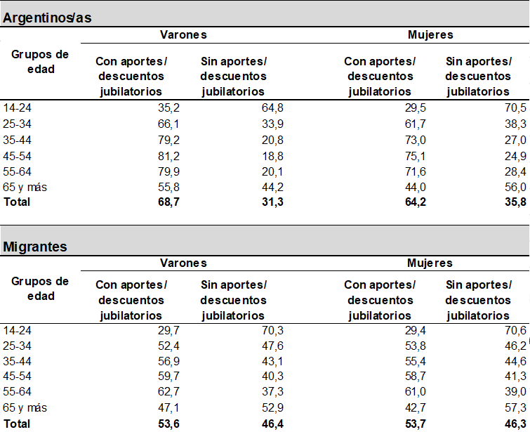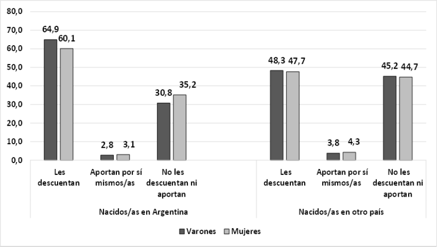 En otras palabras, si se considera la proporción de asalariados/as sin aportes -es decir, en situación de informalidad-, esta alcanza al 30,8% de los varones y al 35,2% de las mujeres nacidos/as en Argentina. En el caso de la población migrante, la informalidad afecta a casi la mitad de los/as asalariados/as 45%, sin diferencias entre varones y mujeres. Esto último resulta llamativo, ya que investigaciones precedentes (Cerrutti, 2009; OIT, 2015; Bruno y Maguid, 2018) habían evidenciado niveles más elevados de informalidad entre las mujeres migrantes respecto de sus pares varones. La equiparación observada en la actualidad podría ser indicativa de transformaciones recientes en el mercado de trabajo, como un posible deterioro en las condiciones laborales de los varones migrantes y/o una mejora relativa en los niveles de formalización de las mujeres, tal vez asociada a políticas específicas dirigidas a la regularización del trabajo en casas particulares. Se trata de aspectos de deberán investigarse en el futuro.