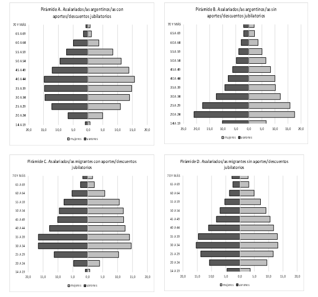 La Figura 3 incluye cuatro pirámides de población que permiten comprender más detalladamente los contrastes etarios dentro del universo de personas asalariadas. Las dos pirámides de la fila superior (A y B), correspondientes a asalariados/as argentinos/as, presentan formas estructuralmente distintas. La pirámide A, relativa a quienes cuentan con aportes o descuentos jubilatorios, exhibe un perfil demográfico en transición al envejecimiento, es decir, tiene una base estrecha, producto de la menor presencia de jóvenes, y un ensanchamiento en el tramo central, correspondiente a personas adultas. Se destaca, además, una moderada sobrerrepresentación femenina entre los 40 y 59 años, lo que sugiere que las mujeres formalizadas tienden a ser de mayor edad que sus pares varones. Por su parte, la pirámide B, que representa a asalariados/as sin aportes ni descuentos jubilatorios, muestra una estructura joven, con base ancha y progresiva reducción hacia las edades mayores. En este caso, los varones de entre 20 y 29 años constituyen el grupo más afectado por la informalidad.