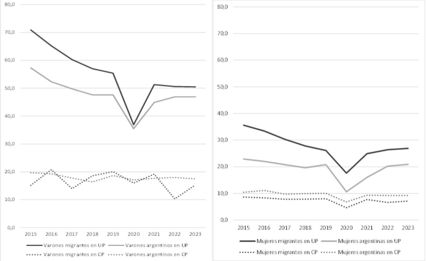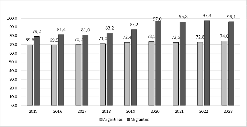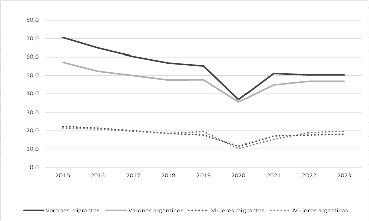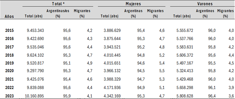 La mayor parte de esas personas son nacidas en Argentina, siendo 95,5% el promedio en el periodo considerado. Al interior del universo de mujeres, las migrantes representan un 5% en promedio, mientras que entre los varones los migrantes representan un 4%, lo cual está en consonancia con la leve feminización de la migración que señalamos antes.