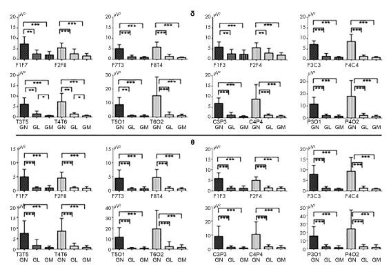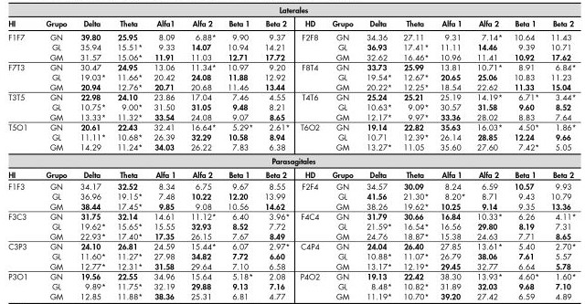 La PR de δ fue significativamente mayor en GN que en GL en todas las DLA y DPS, excepto en fronto-frontales y témporo-occipitales izquierdas; mientras que, comparado con GM, fue significativamente mayor en témporo-temporal, centro-parietal y parieto-occipital izquierdas, así como en todas las derivaciones derechas. Las PR fueron similares entre el GL y GM en esta frecuencia.