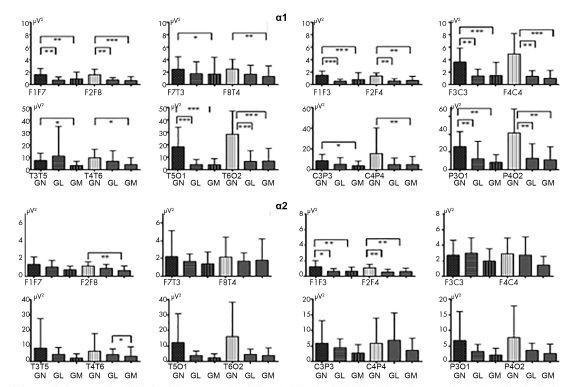 El PPA de α1 de GN fue menor comparado con GL y GM, tanto en las DLA como en las DPS, significativamente para GM en todas las derivaciones y para GL sólo en fronto-frontales, témporo-occipitales y parieto-occipitales. El PPA fue similar en todas las derivaciones para los grupos GL y GM (figura 2).